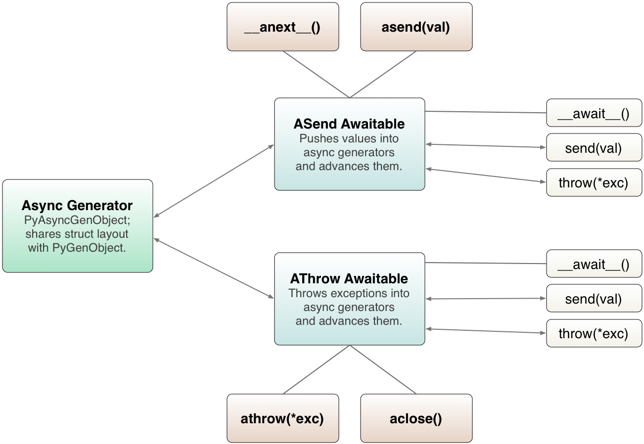 Asynchronous generators define both of these methods. Let’s manually iterate over a simple asynchronous generator: